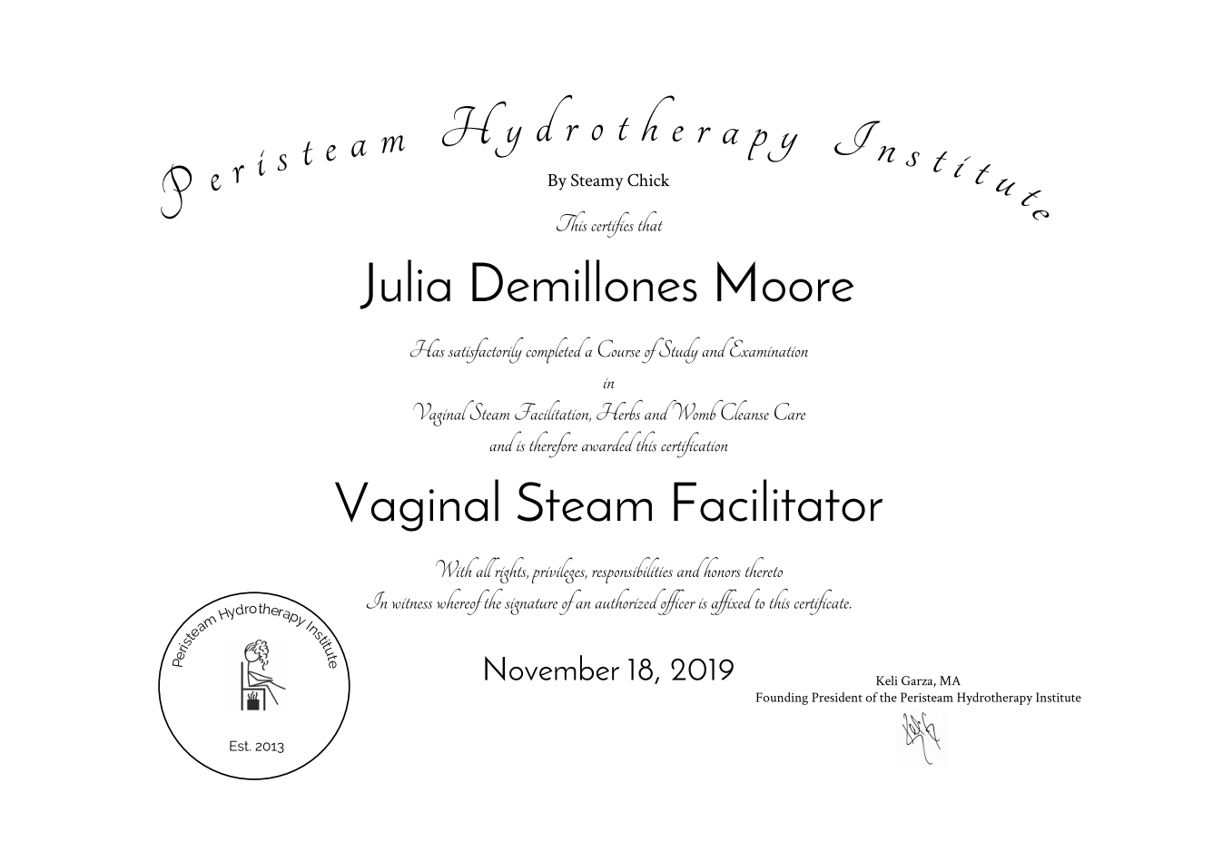 Since 2019 (Peristeam Hydrotherapy Institute)